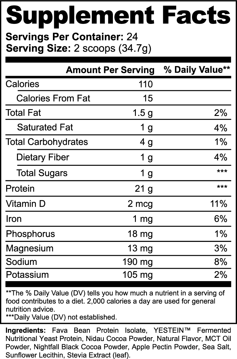 Ingredients: Tendra® Fava Bean Protein Isolate, YESTEINTM Fermented Nutritional Yeast Protein, Nidau Cocoa Powder, Natural Flavor, MCT Oil Powder, Nightfall Black Cocoa Powder, Apple Pectin Powder, Sea Salt, Sunflower Lecithin, Stevia Extract (leaf).